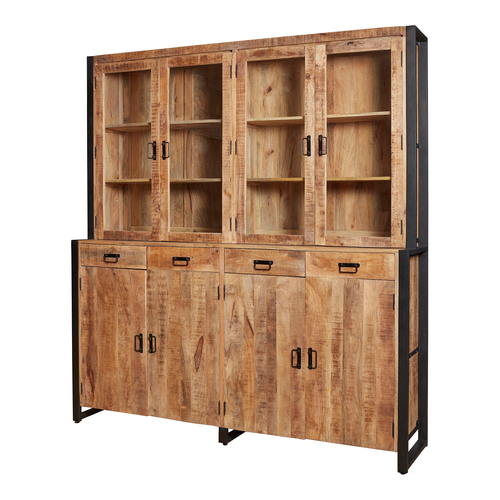 Der Vitrinenschrank Zavan XXL besteht aus Mangoholz, wobei der Metallrahmen und die Metallgriffe mit schwarzem Lack überzogen sind. Dieses Modell verf ügt über vier Schubladen und acht T üren, hinter denen sich praktische Regale befinden. Zudem ist die Vitrine mit mehreren Leisten aus lackiertem Holz eingelegt, was dem Möbelst ück seinen zeitgenössischen Charakter verleiht.Abmessungen: - Breite: 200 cm - Tiefe: 45 cm - Höhe: 220 cm   Pflege: mit einem leicht feuchten Tuch abwischen. Montage: Selbstmontage.