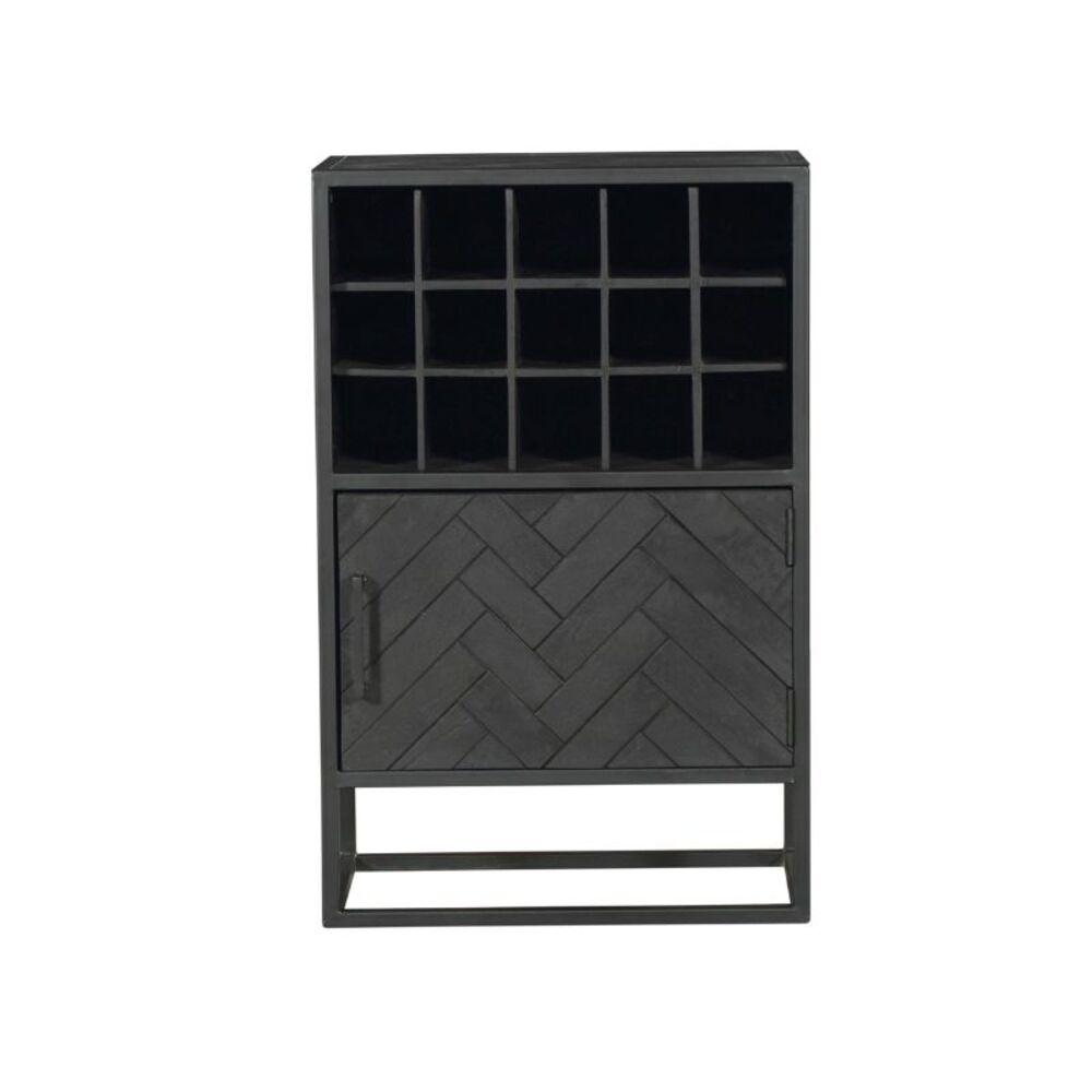 Der Weinschrank 'Cosmopolitan' besteht aus sandgestrahltem Mangoholz und ist mit einem schwarzen Lack behandelt. Der Metallrahmen sowie die Metallgriffe sind ebenfalls schwarz lackiert. Der Schrank verf ügt über eine T ür mit einem eingelegten Fischgrätenmuster und bietet Platz f ür 15 Weinflaschen in 15 Fächern. Abmessungen: Breite: 55 cm Tiefe: 35 cm Höhe: 90 cm Zur Pflege gen ügt es, den Schrank mit einem leicht feuchten Tuch abzuwischen. Abmessungen Breite: 55 cm Tiefe: 35 cm Höhe: 90 cmPflege: mit einem leicht feuchten Tuch abwischen.